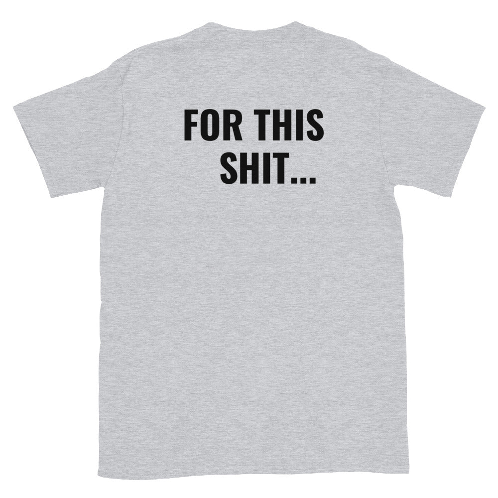 • Etupuolella printti "Too old...", takapuolella "For this shit...".